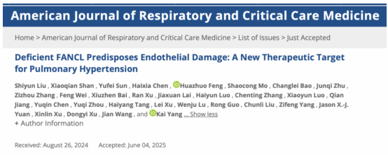 6月6日,开云kaiyun官方网站附属第一医院、呼吸疾病全国重点实验室王健、杨凯团队在呼吸与危重症医学领域顶刊Am J Respir Crit Care Med发表了题为“Deficient FANCL Predisposes Endothelial Damage: A New Therapeutic Target for Pulmonary Hypertension”的原创研究论文。