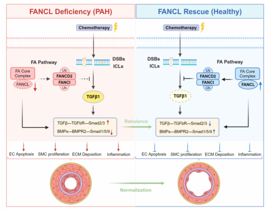肺动脉高压是一种严重的心肺血管疾病,严重威胁人类健康。I型动脉性肺动脉高压(PAH)表现为肺血管阻力增加和闭塞性动脉重塑、存在丛状病变和肺小血管丢失。近年来的研究表明,烷化剂类化疗药的使用可导致DNA损伤修复异常并与PAH发病和肺血管损伤密切相关。烷化剂可诱导DNA链间交联(ICL)和双链断裂(DSB)发挥遗传毒性,而这些损伤可被范可尼DNA修复通路(FA)识别和修复。该研究首次报道了范可尼DNA修复通路核心因子FANCL下调可诱导DNA损伤积聚并导致TGF-β超家族的亚通路失衡,在内皮细胞损伤和肺血管重塑中发挥关键作用。回补FANCL表达、保护DNA损伤或抑制TGF-β通路可显著改善肺动脉高压进程,为该类疾病的防治提供了新策略。