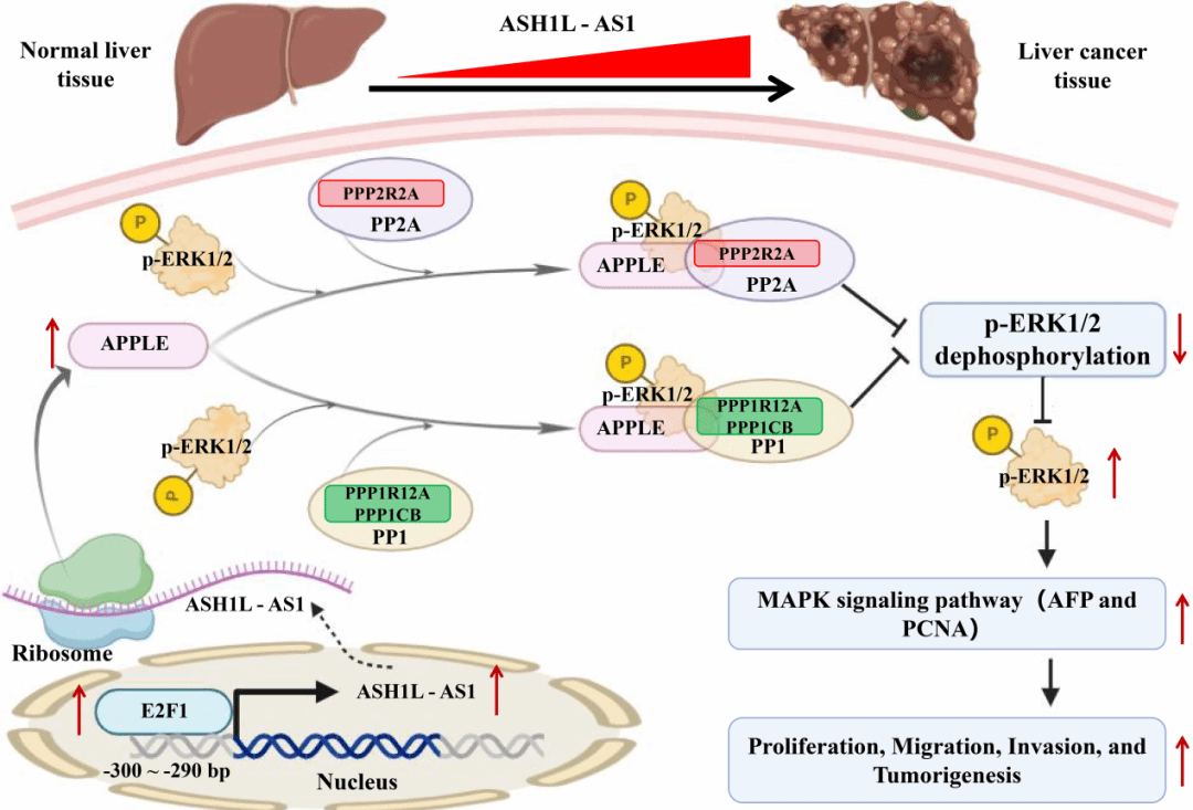研究发现,ASH1L-AS1编码微蛋白APPLE在HCC细胞及肿瘤组织中稳定上调,且高表达与不良预后密切相关。功能实验显示,APPLE促进HCC细胞增殖、迁移与侵袭,并推动异种移植瘤生长;其敲低或ERK1/2抑制可显著逆转相关表型,提示其为HCC发展的重要驱动因子。