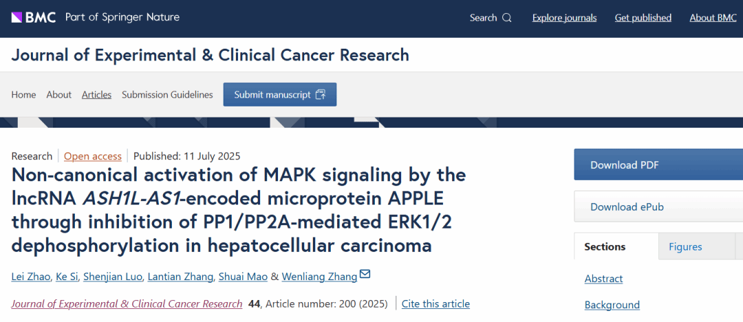 近日,广医-广州生物院联合生科院张文亮教授团队在国际肿瘤学权威期刊Journal of Experimental & Clinical Cancer Research(《实验临床癌症研究杂志》)发表题为Non-canonical activation of MAPK signaling by the lncRNA ASH1L-AS1-encoded microprotein APPLE through inhibition of PP1/PP2A-mediated ERK1/2 dephosphorylation in hepatocellular carcinoma的研究论文。该研究报道lncRNA ASH1L-AS1在肝癌中通过编码一段90个氨基酸的微蛋白APPLE,直接干预ERK1/2去磷酸化过程,从而以非经典方式持续活化MAPK信号通路,显著促进HCC的进展。