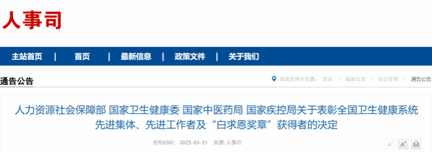 3月31日,人力资源社会保障部、国家卫生健康委、国家中医药局、国家疾控局发布全国卫生健康系统先进集体、先进工作者、“白求恩奖章”获得者表彰名单。在这次评选中广州妇儿中心内科部副主任、呼吸科病区主任印根权荣获“全国卫生健康系统先进工作者”称号。