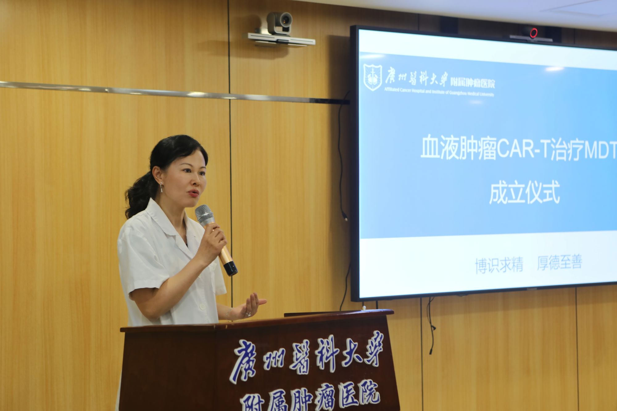 肿瘤内科主任郑燕芳教授主持成立仪式。她表示,团队由肿瘤内科、放疗科、重症监护室、神经外科、病理科、检验科、影像科、核医学科、超声科、护理等多个学科的专家组成。多学科协作是提升CAR-T治疗成功率的关键,团队成员将根据实际情况制定本院CAR-T治疗相关制度、流程及应急预案,对拟行CAR-T治疗患者进行多学科联合评估与筛选,并定期召开MDT病例讨论会,制定个体化综合治疗方案。