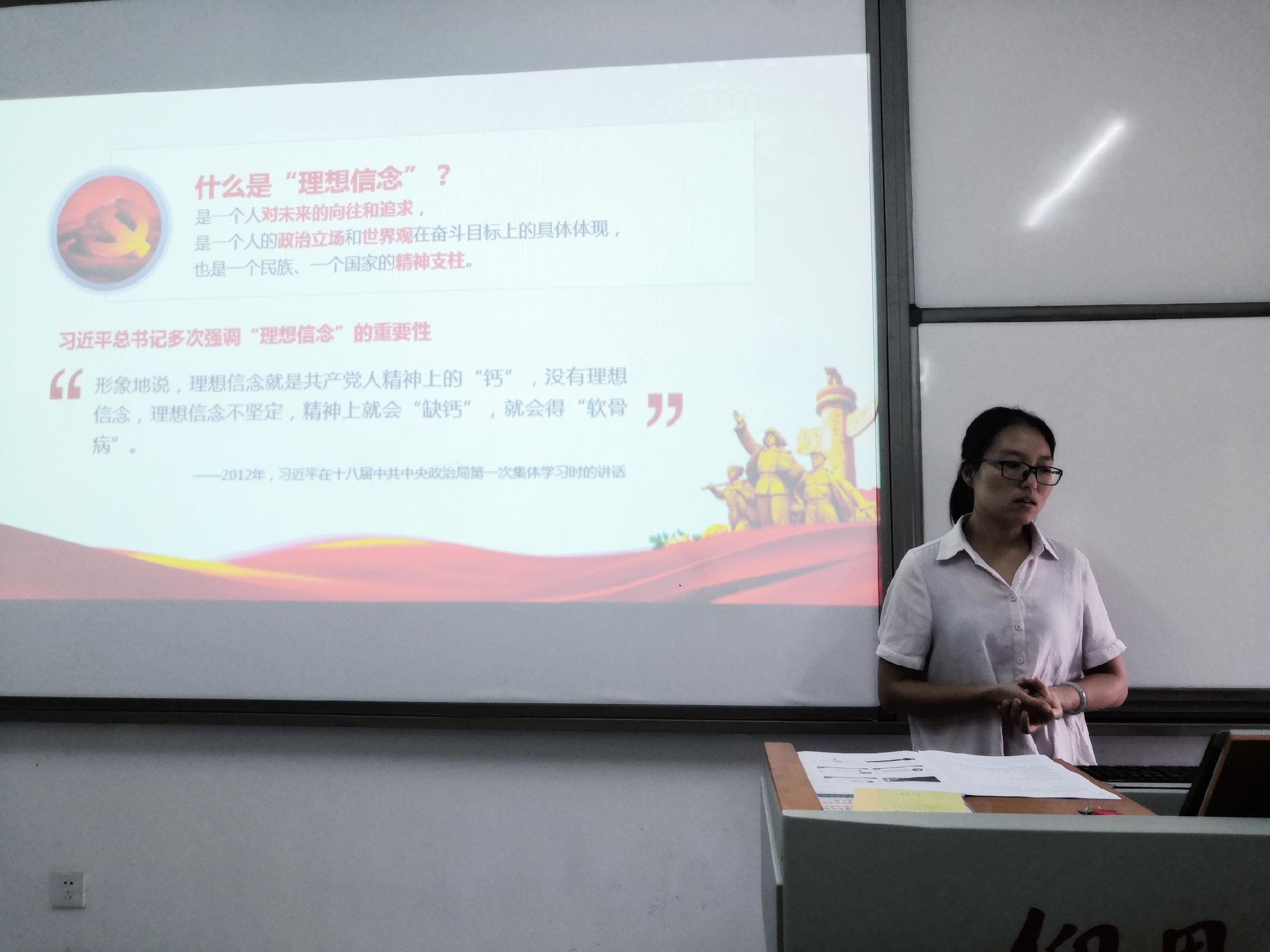 面对以上这些情况,她还提到大家应该要坚定人生信念,树立崇高理想。一是做到必须强化理想信念“三种精神”,即理想信念的“纪律精神”、“服务精神”、“模范精神”,做到“真严真查真问责,真学真改真落实”,坚持全心全意为人民服务,起到模范带头的作用。二是“践行理想信念的四个加强”,即加强自我教育,加强理论武装,加强实践实训,加强道德修养,做到把思想政治教育的目标和要求变成年轻党员的自我探索,自我获得的一种内在的自主性探索的需要。并且她还强调,党员定要永远铭记入党誓词,做到“不忘初心、牢记使命”。