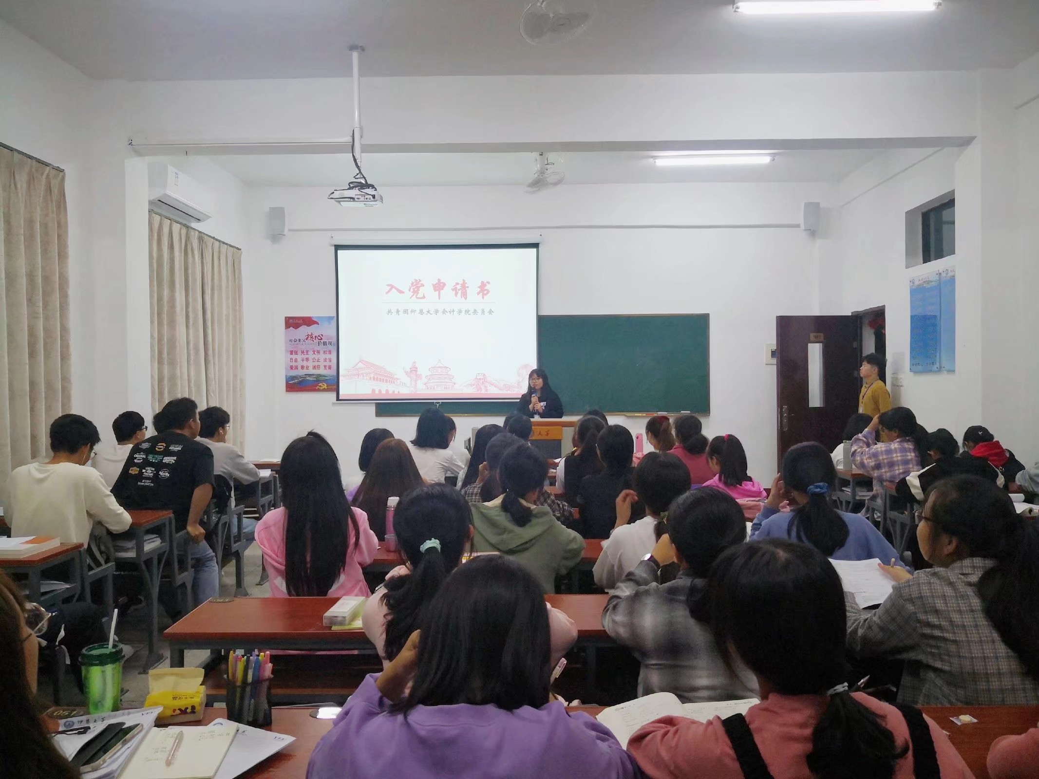 首先,组织部干事简要介绍了入党流程,并对入党条件与要求进行讲述。随后,就如何撰写规范入党申请书进行了详细辅导,从标题、称谓、正文内容到落款,细致入微。充分的讲解和精美的课件展示使同学们对党组织的认同和向往进一步增强。培训的最后,组织部的成员们鼓励同学们积极提交入党申请书,主动接受党组织的考验,并对入党申请书的递交时间和方式进行了说明。