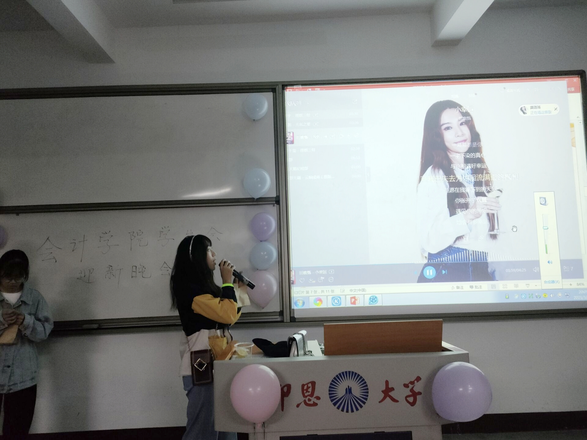 迎新晚会在学权部苏颖同学的歌曲《云烟成雨》中拉开了帷幕。一曲结束,主持人用欢快的游戏将会场的热情调动起来。宣传部的舞曲《可爱摆》嗨起全场,用可爱的摇摆动作展现青春活力;文体部的书法作品《前程似锦》用优美的文字表达对学生会的美好祝愿;纪检部演绎的《四小天鹅》有趣又生动。各类游戏和抽奖穿插在节目表演之中,活跃现场的气氛,在游戏的惩罚环节,同学们听到了优美动听的《无名之辈》、《小幸运》、《演员》、《Monsters》等歌曲; 在小游戏“抓鸭子”的环节,籍潇鹏老师的加入更是将晚会氛围推向了高潮。最后,办公室带来的歌曲《动物世界》为晚会画上圆满的句号。