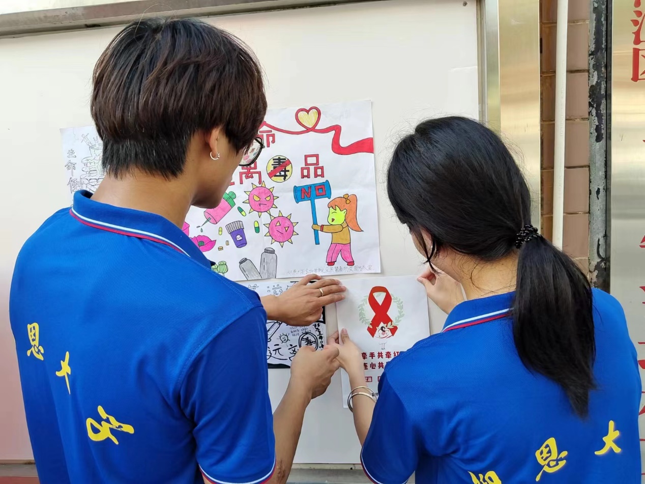 洋坑村李连成书记与实践队员们简单交流后,为其提供需要的场地以及材料。队员们在村委会前的工地进行了情景剧表演,帮助村民们切身感受到禁毒防艾在日常生活中是不容忽视的,需要每个人的努力。一块小黑板,承载着队员们的心血。队员们为村公告栏绘制板报,采用图形、毒品与红丝带等元素提醒人们禁毒防艾,号召村民们自觉抵制毒品,加强自身防范,预防艾滋病。活动结束后,李书记表示,村里从前并未重视禁毒方面的工作,此次实践队为村里的宣传事业提供了新思路,日后村里也将重视禁毒防艾宣传工作的展开。