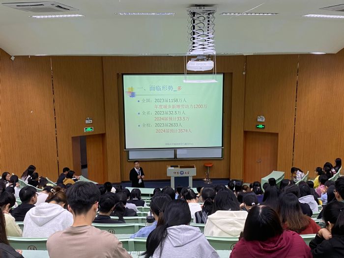 朱玉华老师以“强信心、促发展、先就业、后择业、再立业”为主题展开分享,他结合自身丰富的工作经历,从“多”“高”“低”“热”“冷”五字概括了当前的就业形势特点,从调整就业心态、提升能力、适应职场、风险管控四个方面告诉同学们如何应对就业困难,从早谋划、早准备、早行动、重落实、忌攀比、互帮扶六个角度阐述了个人的谋划发展。整场报告会,朱老师发自肺腑、慷慨激昂,鼓励同学们要满怀勇气、坚定信心去迎接就业的困难和挑战,也祝愿同学们都能找到满意的工作,前程似锦。