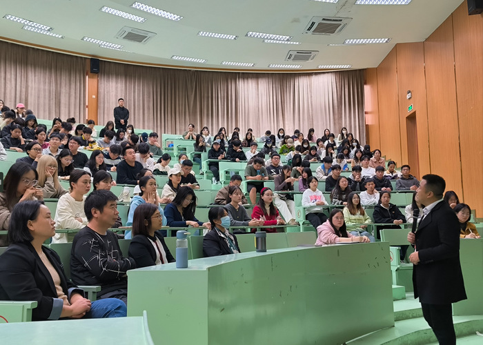 紧接着,吴胜潮老师也上台做了简短分享。吴老师向同学们着重强调了职业的内驱力,号召大家追求更进一步的内在发展,提高就业竞争力,立足长远发展。同时告知同学们要摆正自己的心态,结合个人、家庭和社会实际去就业和择业。