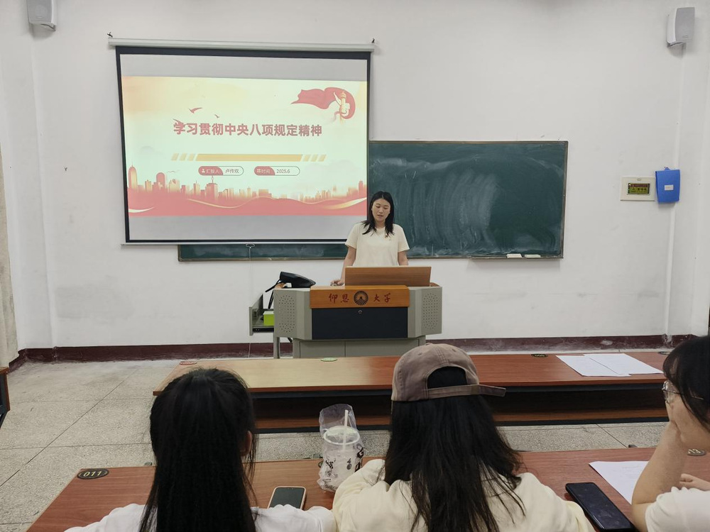 2025年6月12日,财务管理系学生党支部书记卢传欢在祥贤楼103室为支部党员讲授“学习贯彻中央八项规定精神”专题党课。